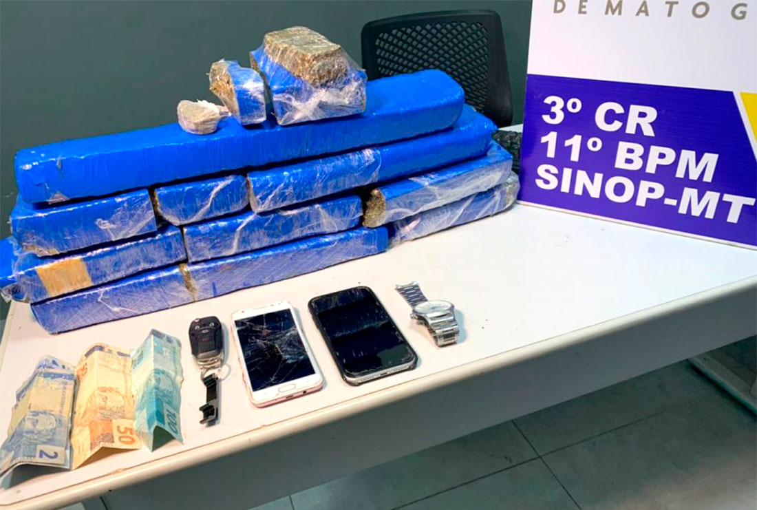 A Polícia Militar prendeu dois homens com 10 quilos de maconha, ontem, em Sinop. A apreensão gerou um prejuízo de mais de R$ 25 mil para a organização criminosa. Os policiais da Agência Regional de Inteligência monitoravam um dos suspeitos, quando receberam mais informações de que o homem estaria distribuindo cerca de sete quilos de droga para uma organização criminosa, nas proximidades de um supermercado da cidade.