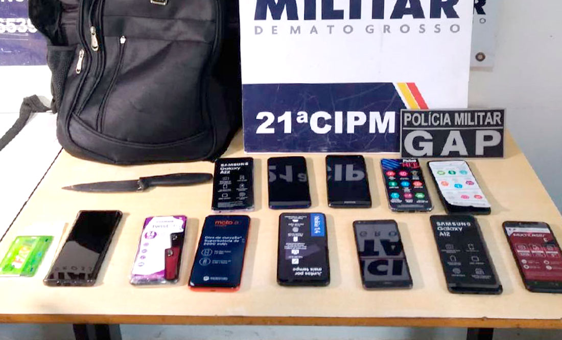 Os policiais conseguiram abordar os jovens, de 19 e 23 anos) e na busca pessoal a um dos suspeitos encontraram os aparelhos celulares numa bolsa preta, além de uma faca.