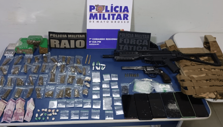 Equipes da Polícia Militar apreenderam, ontem à noite, um simulacro de fuzil, um revólver, munições e 93 porções de entorpecentes, entre maconha e pasta base de cocaína em Sapezal (510 km de Cuiabá). Na ação, uma adolescente de 16 anos foi apreendida e dois homens, de 18 e 21 anos, foram presos suspeitos por tráfico de drogas e porte ilegal de arma de fogo.
