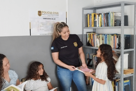 A biblioteca comunitária funciona de maneira simples e inclusiva. Qualquer pessoa da comunidade pode visitar a delegacia e retirar um livro de forma totalmente gratuita.