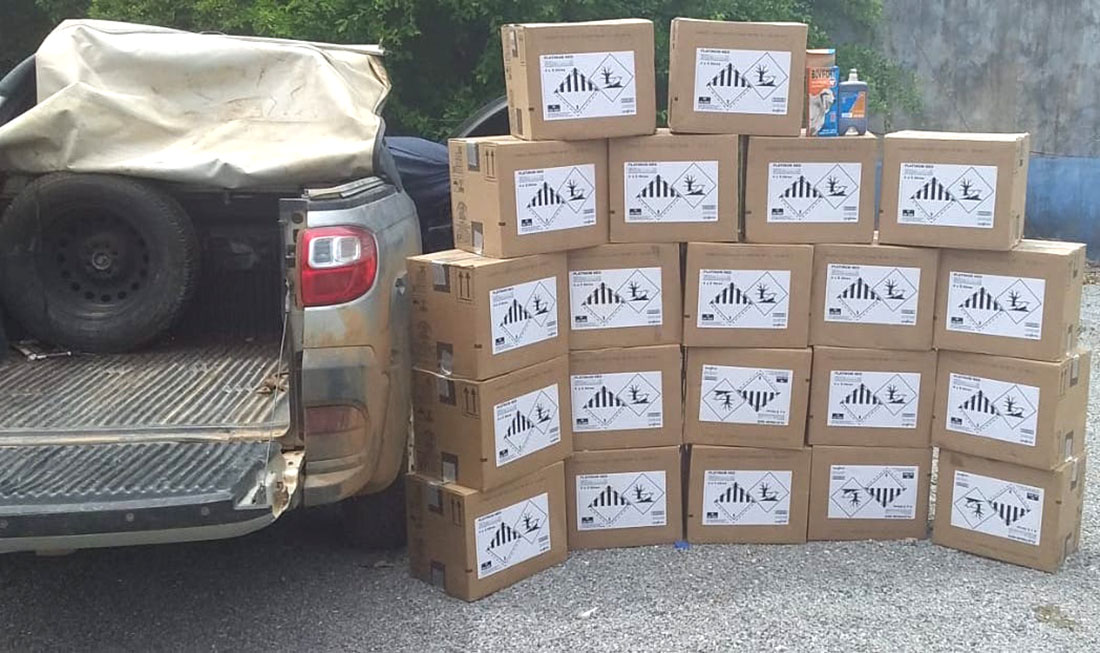 A Polícia Militar em apoio ao Instituto de Defesa Agropecuária (Indea) prendeu, hoje de manhã, um suspeito, de 26 anos, com 21 caixas contendo quatro galões de cinco litros de defensivos agrícolas, que foram furtados de uma fazenda em Feliz Natal (117 quilômetros de Sorriso), no começo do mês.