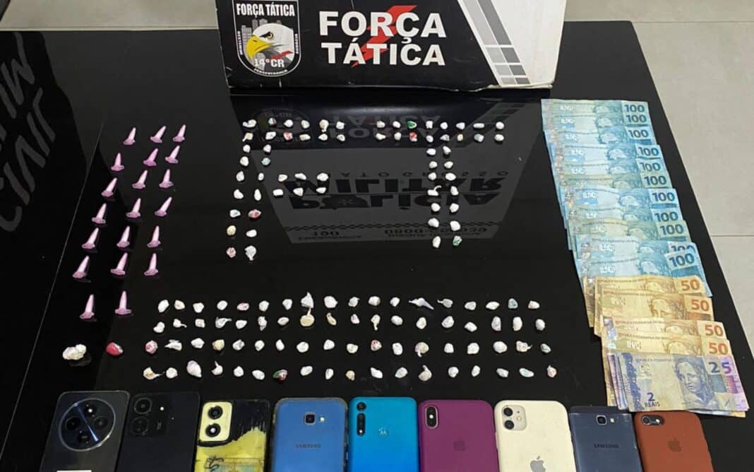 A Polícia Militar desarticulou esquema de tráfico de drogas que funcionava em uma residência do bairro Beija Flor, ontem à noite. Sete homens, incluindo um menor de idade, e uma mulher, que seria a proprietária da casa, foram presos com 156 porções de cocaína e R$ 1,3 mil.