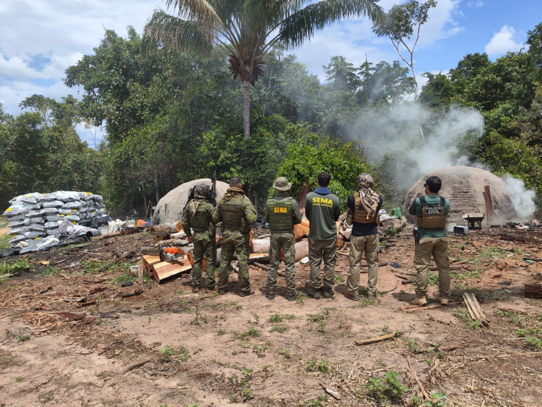 Conforme o registro policial, em operação contra crimes ambientais, as equipes em diligências na carvoaria localizaram inicialmente um suspeito. Foi encontrado dois fornos, um em operação, além de dois paletes com carvão ensacados, totalizando 322 unidades.