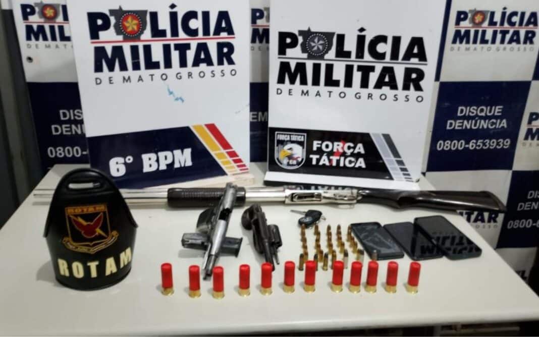 No interior da residência, os militares apreenderam uma pistola de calibre .9mm, um revólver de calibre .38 e uma espingarda de calibre 12, além de munições para os armamentos. Os policiais também fizeram checagem ao veículo Gol que estava na frente da casa e constataram que o carro possuía queixa de roubo, registrado em Cuiabá, neste ano.