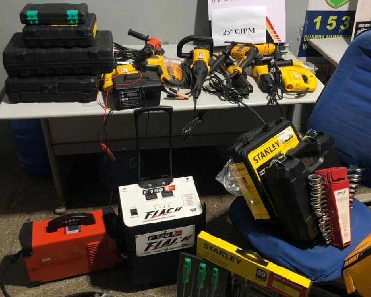 Em revista à mochila, foram localizados diversos objetos como furadeiras, serradeiras, lixadeiras, martelos e baterias. Questionados sobre a procedência, os suspeitos confessaram que os equipamentos haviam sido furtados de uma loja.