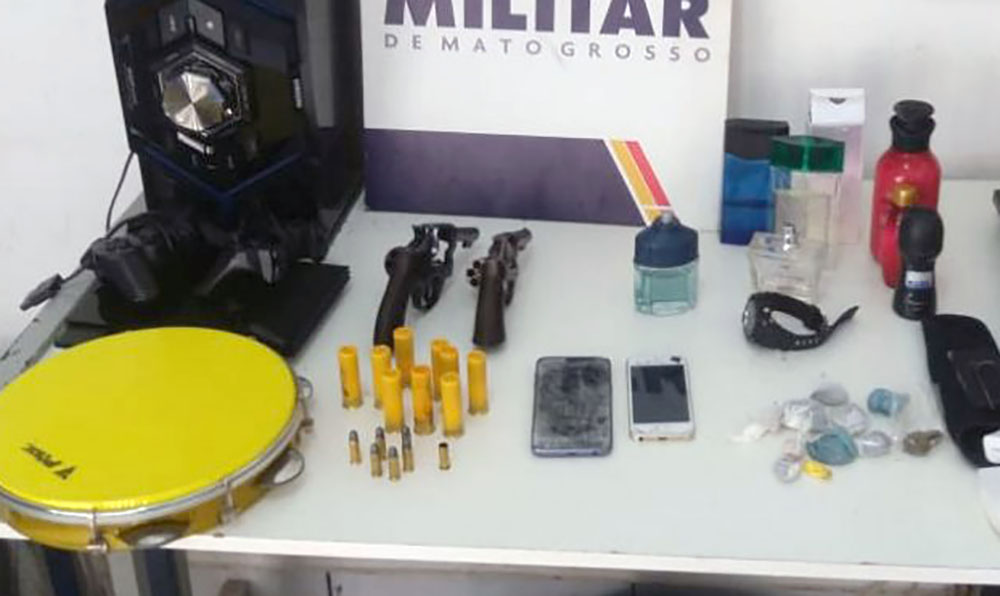 Os militares iniciaram buscas no local e encontraram os revólveres calibres 32 e 38, além de seis munições intactas, e mais nove munições de espingarda calibre .20. Também localizaram oito porções de substância análoga à maconha, duas de pasta base de cocaína e uma de cocaína, além de aparelhos eletrônicos que podem ter origem ilícita.