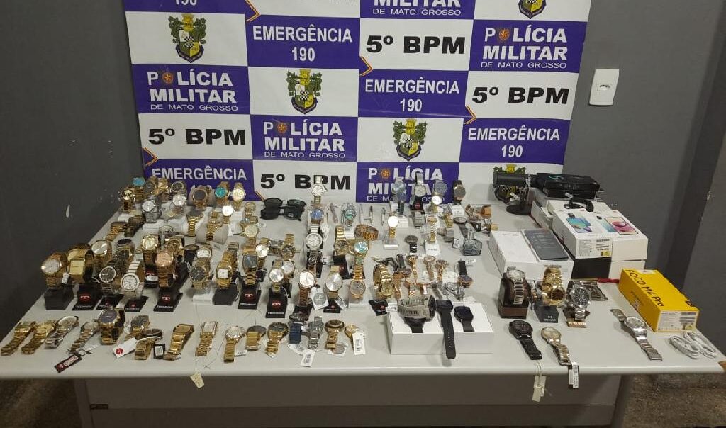 A Polícia Militar recuperou 115 relógios de luxo furtados de um estabelecimento, ontem, em Rondonópolis. Entre os materiais recuperados pela PM, também estão joias, óculos, fones e celulares.