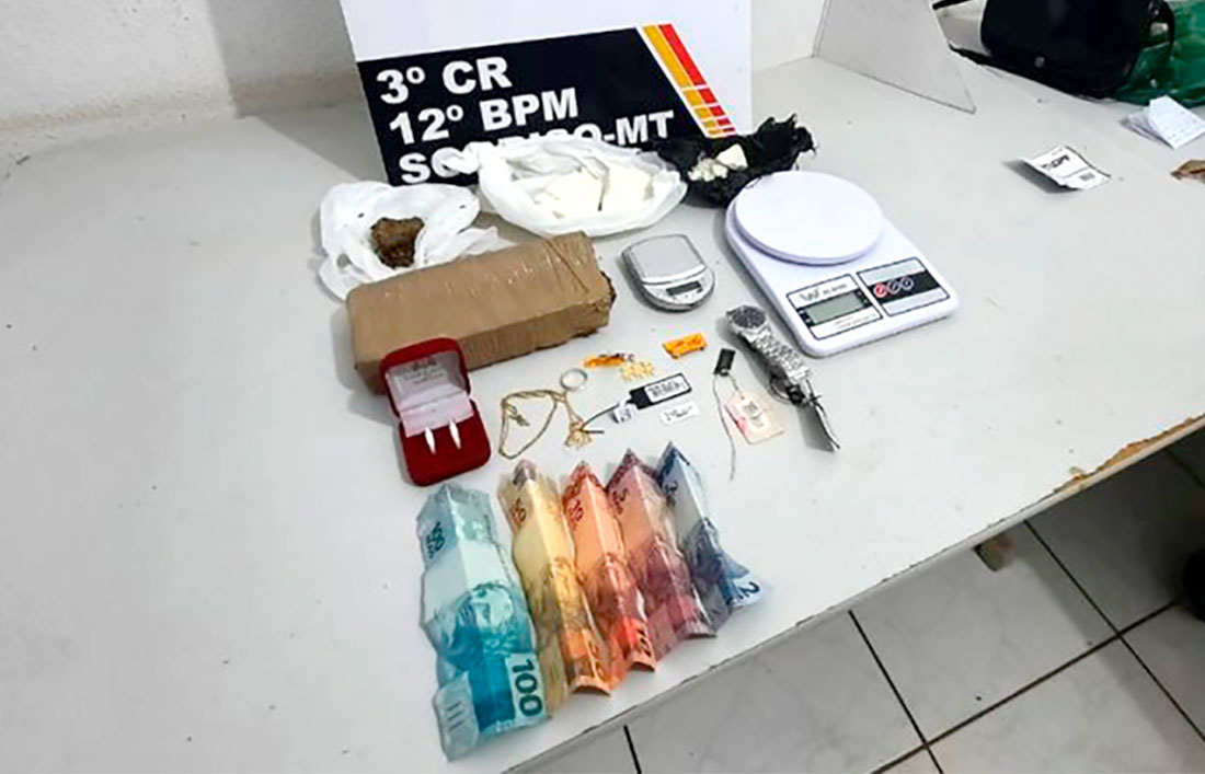 A Polícia Militar conseguiu encaminhar para a delegacia municipal, ontem à noite, dois suspeitos de envolvimento com o tráfico de drogas em Sorriso. Com eles, os militares localizaram uma quantidade de maconha e pasta base de cocaína, dinheiro, balança de precisão e joias que haviam sido furtadas na semana passada em uma ótica do município.