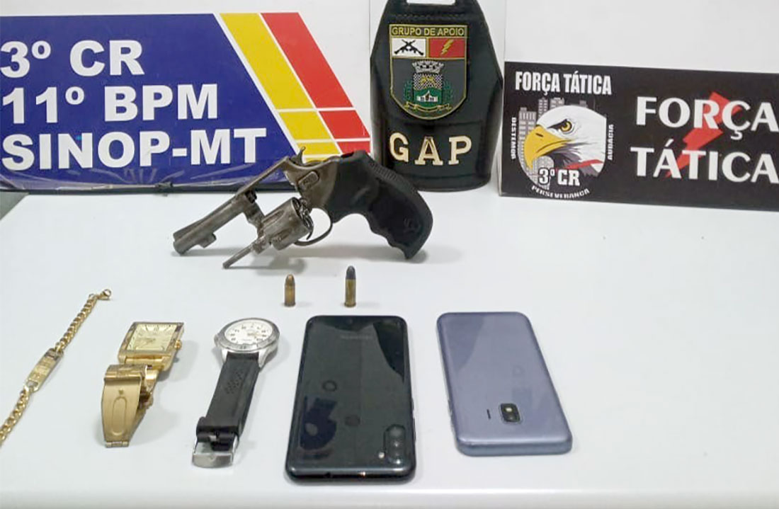 Em busca veicular, a arma e munições foram encontradas em cima do banco. Os suspeitos não confirmaram quem seria o proprietário do revólver, mas confessaram que planejavam cometer o crime.