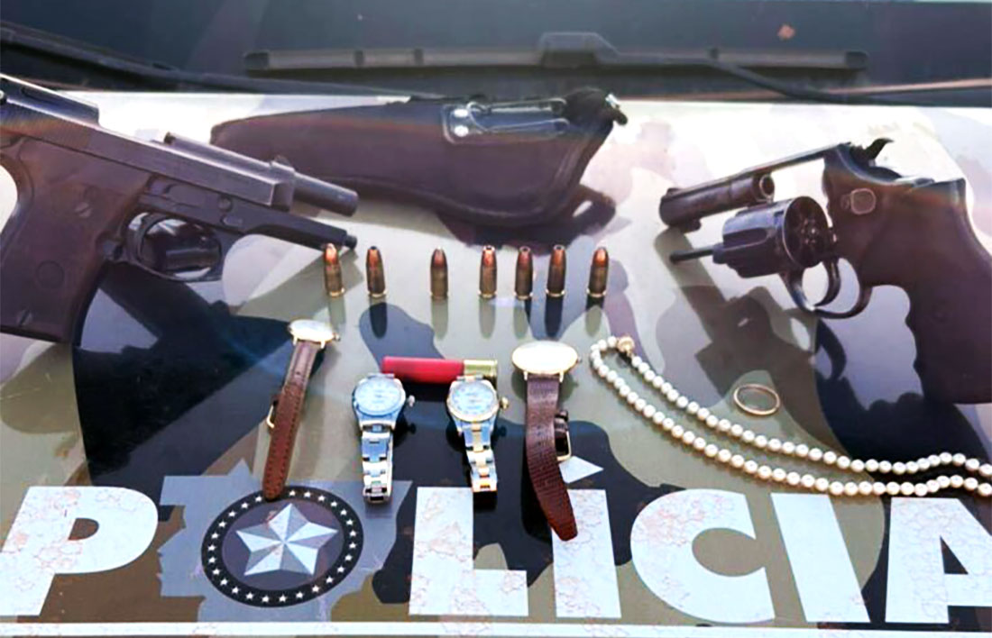 Consta no boletim de ocorrência, que eles são suspeitos de comercializarem arma de fogo. Foram apreendidos um revólver calibre 38, pistola 9 milímetros, sete munições, quatro relógios (avaliados em cerca R$ 140 mil), colar de pérolas e aliança.
