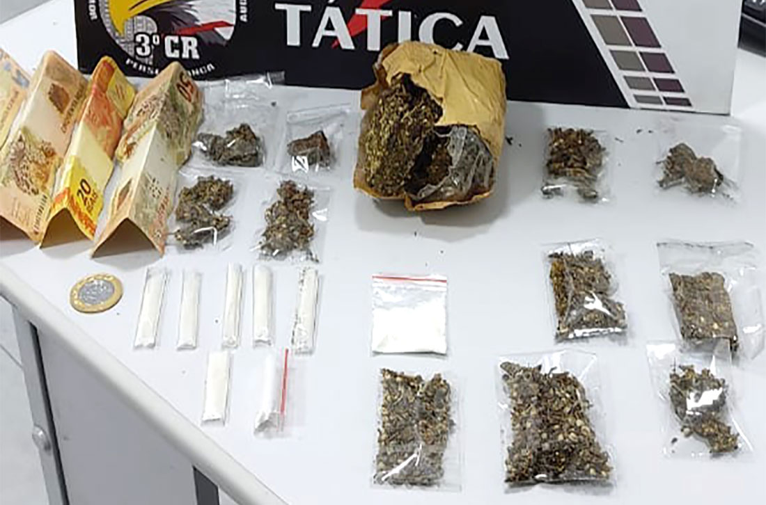 Os suspeitos foram presos, ontem à noite, no bairro Nossa Senhora Aparecida com oito porções de cocaína, onze de maconha e meio tablete do mesmo entorpecente. Um deles confirmou que estava traficando a pedido de um amigo.