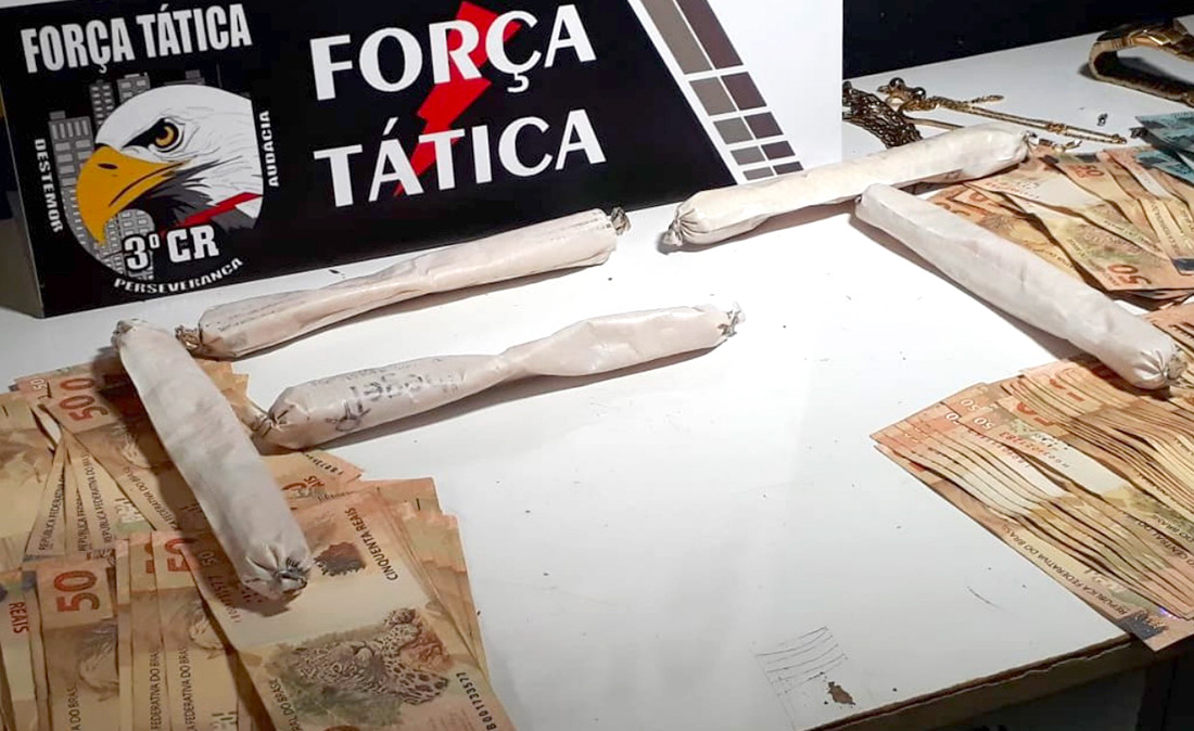 “A Polícia Militar já possuía essas informações que esses dois estariam fazendo o tráfico de entorpecentes na região do bairro Maria Vindilina. A guarnição da Força Tática diligenciando encontrou esse cidadão em um estabelecimento comercial, foi tentar fazer a abordagem, ele fugiu do local e correu em direção da sua residência. A equipe fez o acompanhamento, conseguiu entrar junto com ele na residência e ao fazer as buscas foram encontradas essas cinco emulsões de explosivos e aproximadamente R$ 12 mil”, disse o tenente-coronel da PM, Pedro Miguel de Souza.