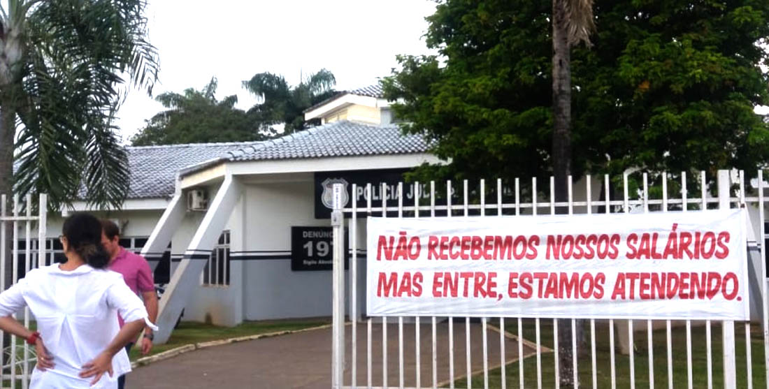 A delegacia de Polícia Civil em Sorriso amanheceu com uma faixa na parede de protesto dos profissionais em relação ao atraso salarial (dezembro) do 13º. “Lutamos pela sociedade e agora pelo sustento da nossa família!. Salário em dia é obrigação!”, consta na faixa para informar os moradores que, mesmo sem receber os atendimento são feitos.