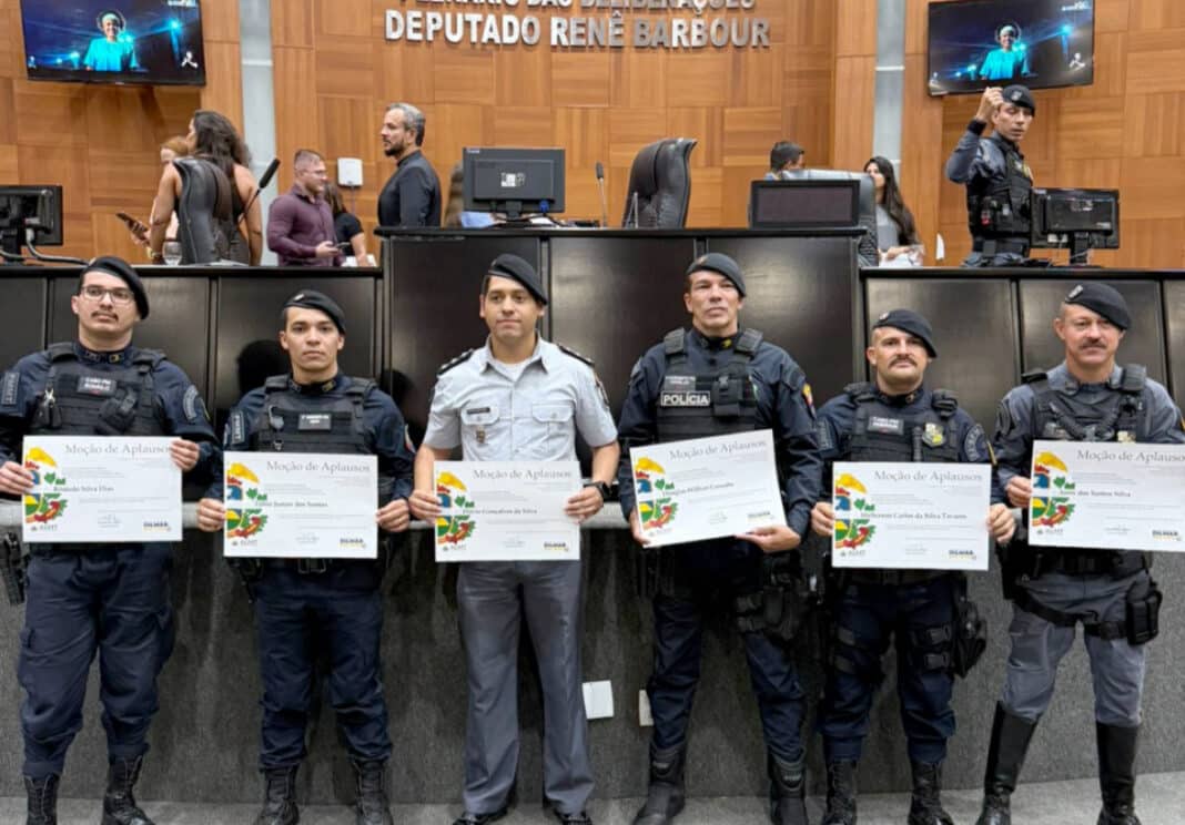 Policiais militares do 3º Comando Regional de Sinop foram homenageados na Assembleia Legislativa, ontem, pelo ato de bravura e dedicação à sociedade sinopense. A ocorrência aconteceu em 18 de abril do ano passado, quando a equipe salvou a vida de uma mulher em surto, armada com uma faca, que havia ateado fogo à própria residência. A homenagem foi feita pelo deputado estadual Dilmar Dal Bosco.