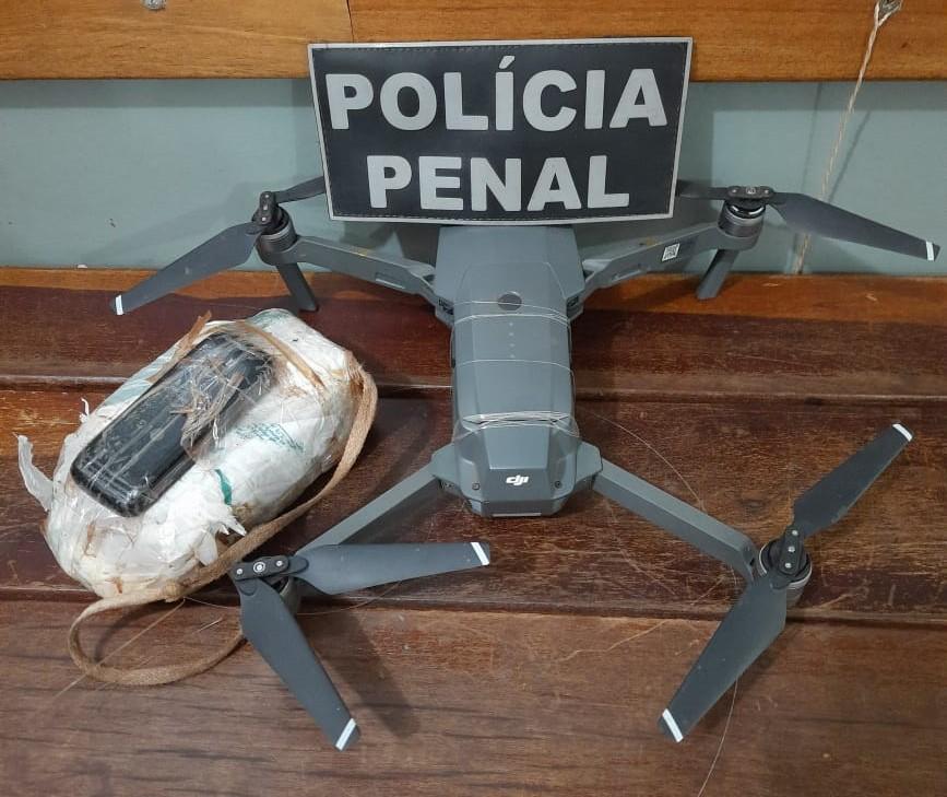 Junto do drone estava um pacote com 500 gramas de substância aparentando ser maconha, uma porção de substância aparentando ser pasta base de cocaína, 18 chips e um aparelho celular.