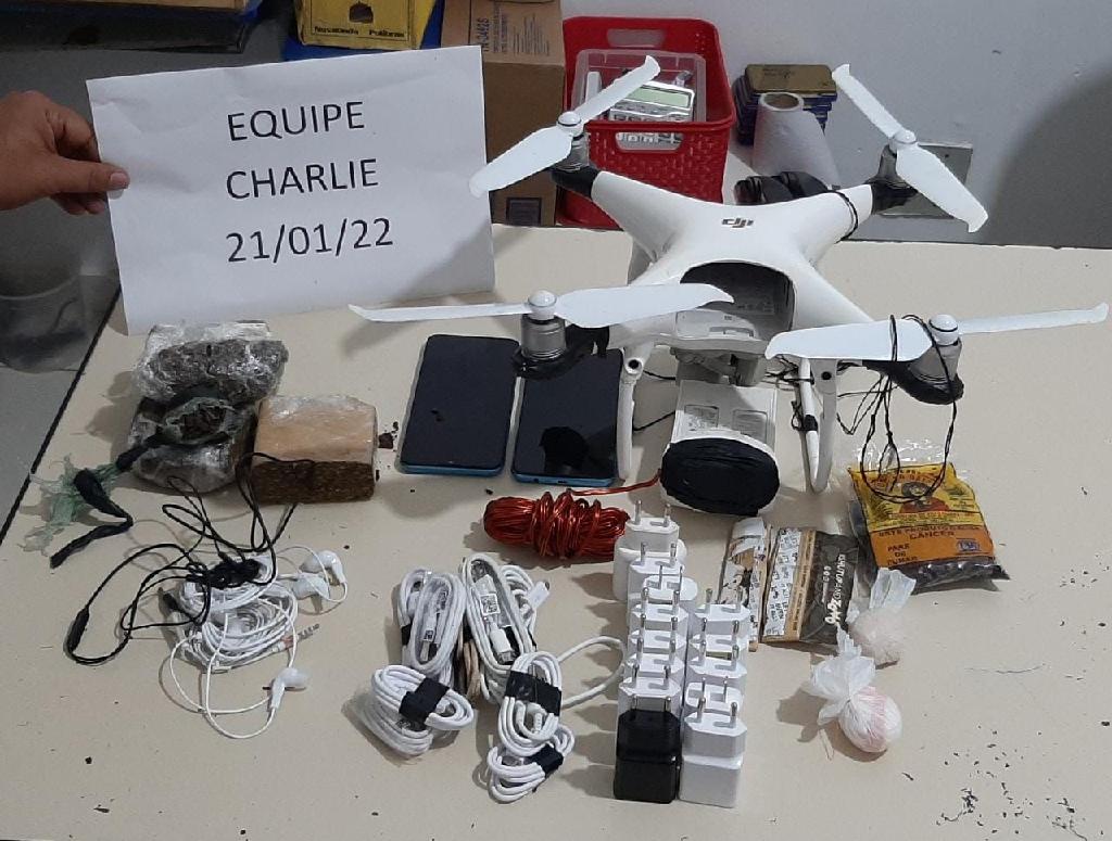 Foram encontrados um drone, dois aparelhos celulares, 13 conectores para carregador, nove cabos USB e quatro fones de ouvido. Os agentes identificaram ainda três pacotes grandes e um pequeno de substância análoga a maconha e dois pacotes pequenos de substância aparentemente análoga à pasta base de cocaína.