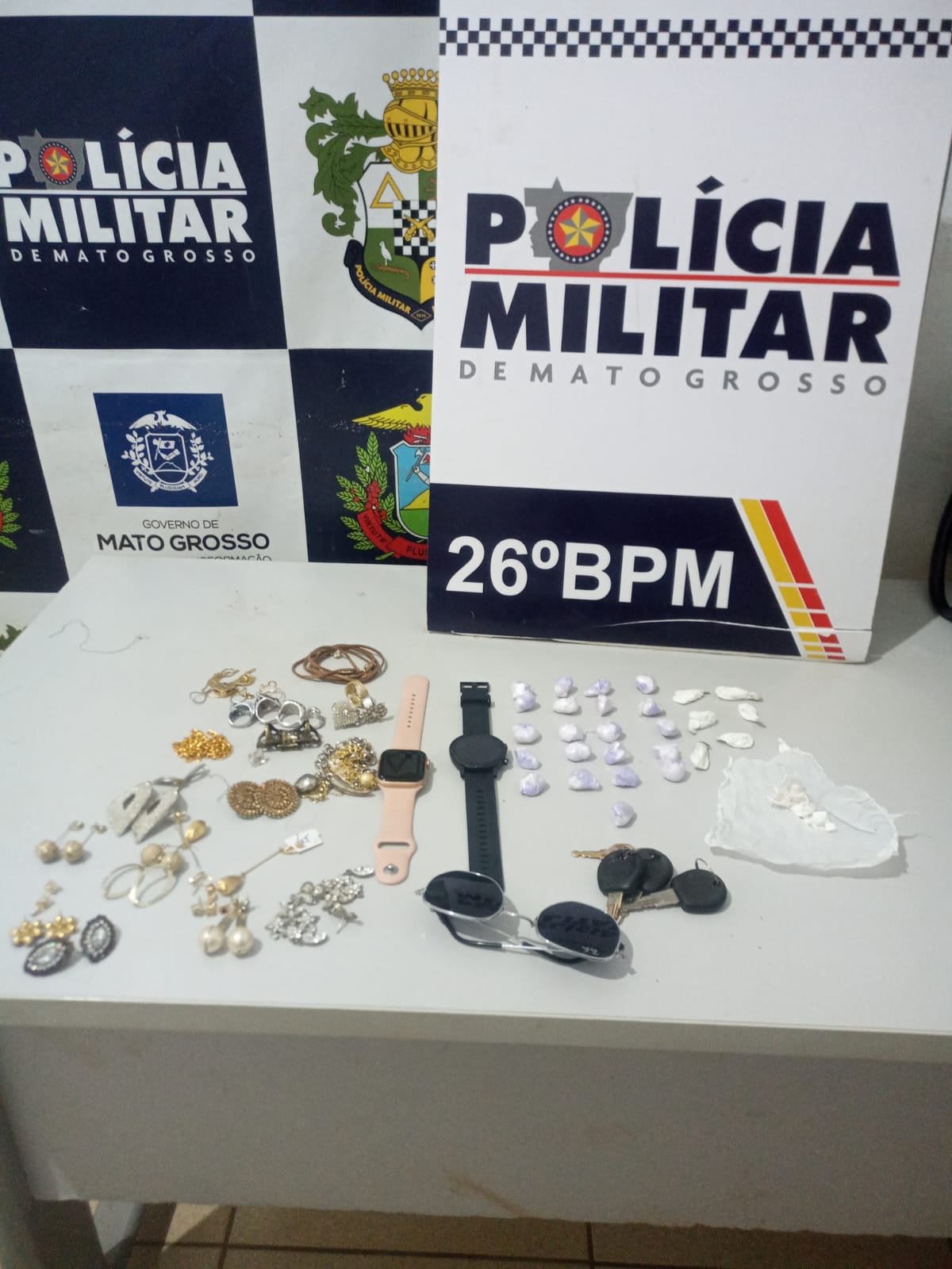 Diante disso, a equipe foi até o local e conseguiu realizar a abordagem, já no quarto em que estavam. Na bolsa de um bebê, os policiais localizaram 29 porções de cocaína, além das chaves do veículo, relógios, joias e outros. Devido a presença da criança no local, o Conselho Tutelar também foi acionado.