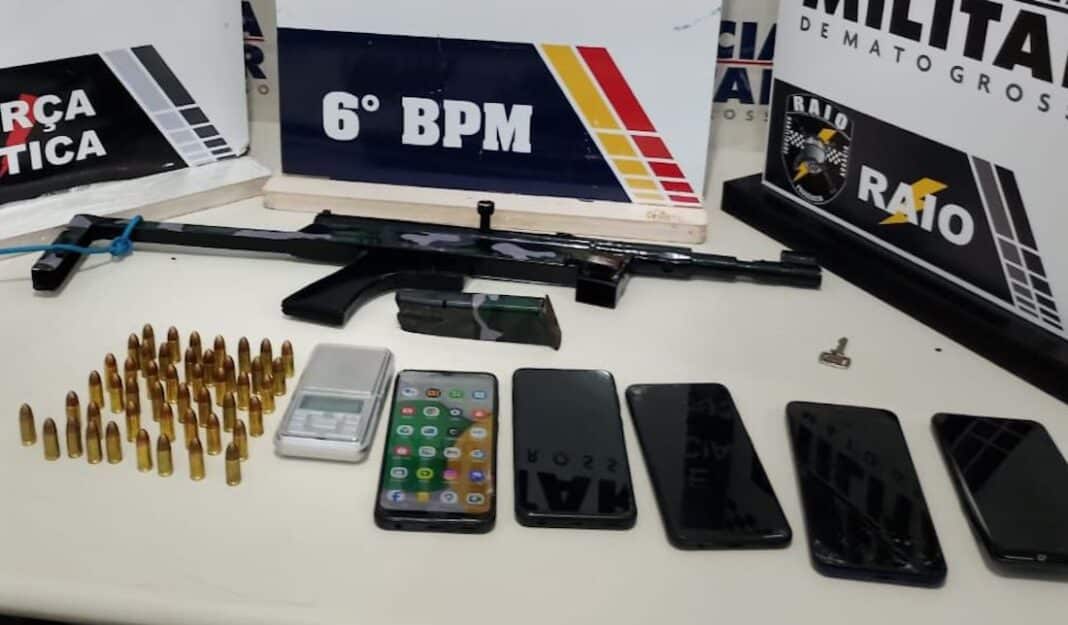 As equipes de Força Tática e Rondas e Ações Intensivas e Ostensivas (Raio) da Polícia Militar prenderam cinco suspeitos, de 18, 19 e 23 anos, ontem à noite, na Travessa da Felicidade, no bairro Lava Pés, em Cáceres (220 km de Cuiabá). Foram apreendidas submetralhadora artesanal e 47 munições calibre 9 milímetros, cinco aparelhos celulares e balança de precisão.