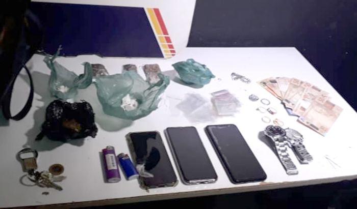 A Polícia Militar apreendeu quatro porções de maconha, sementes da mesma substância, duas porções de cocaína e cerca R$ 323, ontem à tarde. Quatro pessoas, dentre elas dois adolescentes foram detidos.