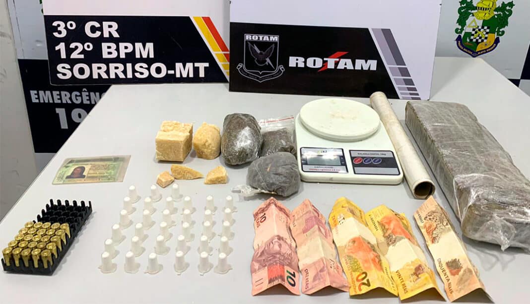 Foram apreendidos uma barra de maconha, 33 pinos de cocaína, dois pedaços grandes de pasta base e três porções menores da mesma substância. Também foram localizadas 25 balas de calibre 380 numa “colmeia”, rolo de plástico filme e balança.