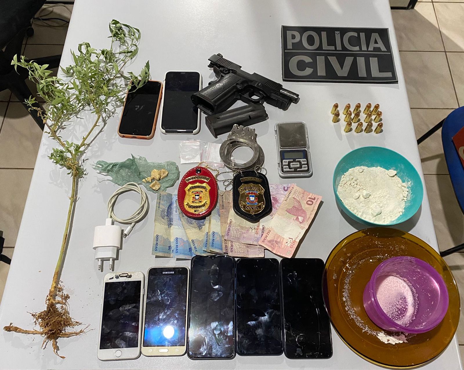 A Polícia Civil está fazendo a operação “Início” cumprindo oito mandados de buscas e apreensões em diversos bairros. A ação, que teve apoio de policiais civis de Sinop, resultou na prisão de seis suspeitos e apreensão de um adolescente. Uma pistola. 40, munições, entorpecentes, celulares e balança de precisão foram apreendidos.