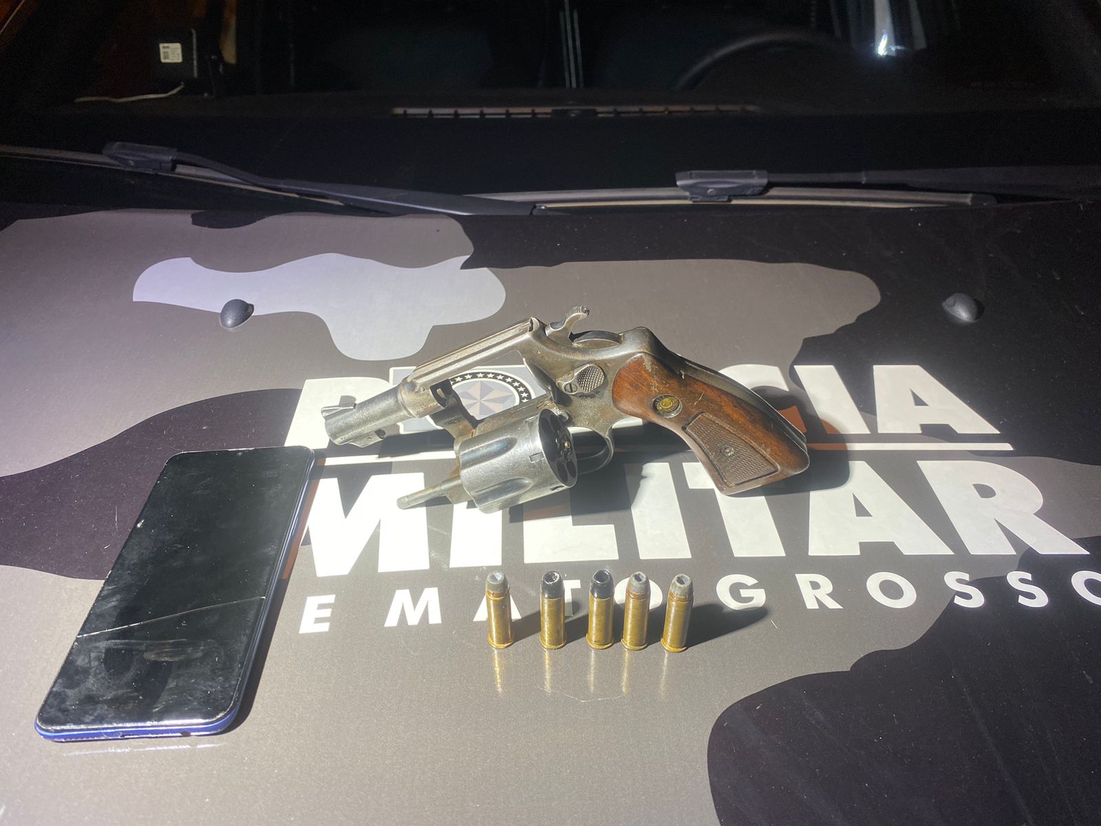 Um revólver calibre 38 com cinco munições foi apreendido.