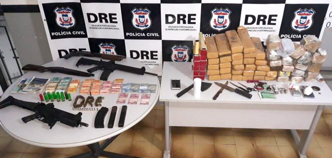 A Delegacia Especializada de Repressão a Entorpecente (DRE) apreendeu um carregamento de aproximadamente 45 quilos de maconha, além de quatro armas de fogo de uso restrito e R$ 19 mil ontem à noite, em uma quitinete no bairro Bosque da Saúde. Três jovens, de 19 e 21 anos, foram presos.