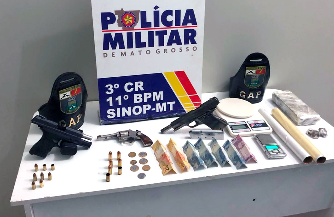 Com os suspeitos foram apreendidas uma pistola calibre 380 (com seis munições intactas e duas deflagradas), uma pistola calibre 45 (cinco munições intactas e duas deflagradas), um revólver calibre 22, R$ 57 e uma bolsa com roupas. Eles estavam numa Honda XRE e outra Titan, ambas pretas.