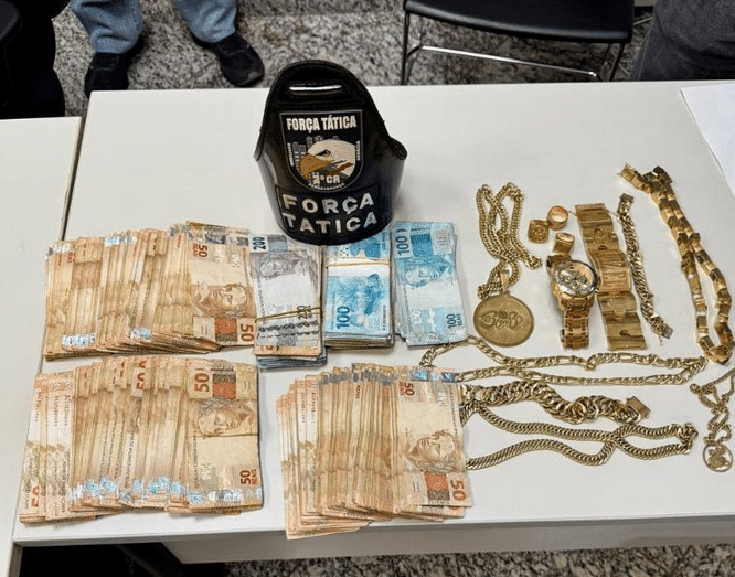 As equipes realizavam o policiamento tático e ostensivo na avenida Couto Magalhães, região central do município, quando flagraram o condutor de uma caminhonete modelo Amarok em alta velocidade. Ao realizar a abordagem do carro, os policiais identificaram dois suspeitos. Em busca veicular, foi encontrado, embaixo do banco do passageiro, uma caixa com R$ 50,9 mil em espécie e diversas joias, aparentando ser de ouro, sem registro fiscal.