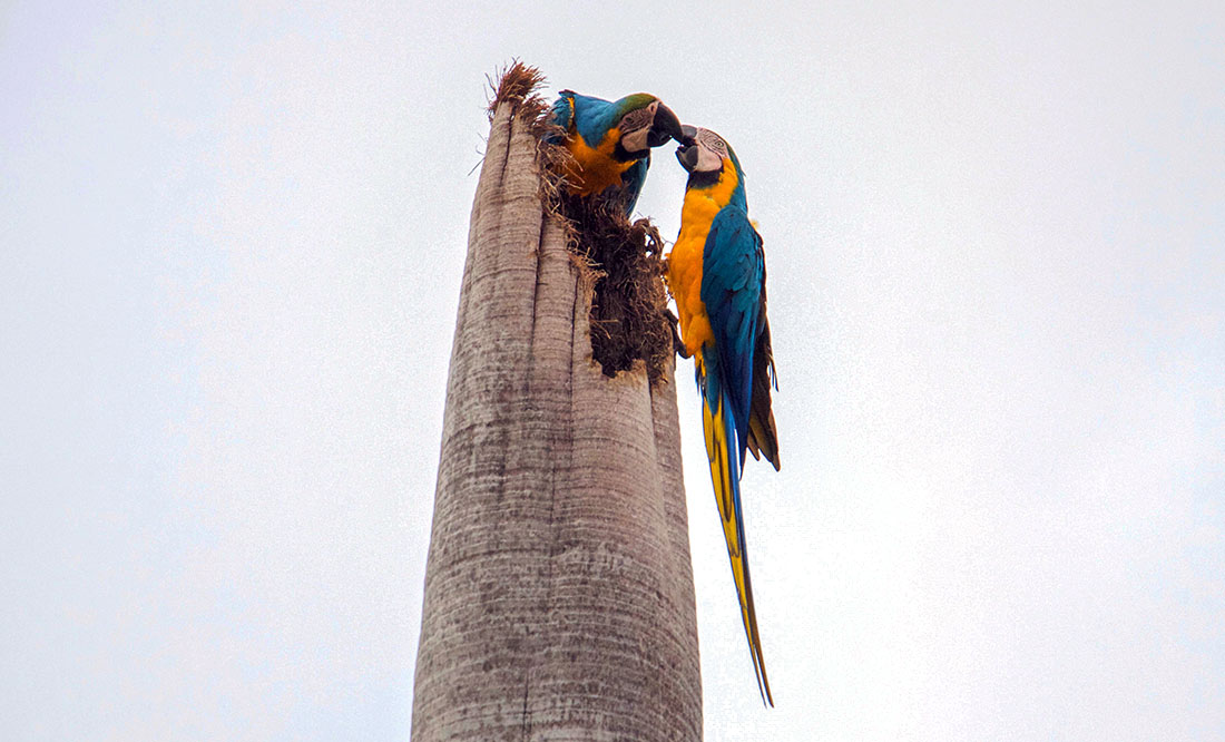 A espécie, conhecida por suas cores vibrantes em tons de azul e amarelo, é uma das mais emblemáticas do cerrado e da Amazônia, podendo ser observada com frequência em áreas de mata e reservas próximas à cidade.