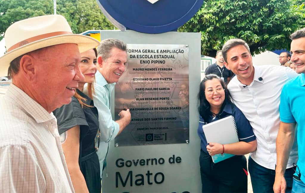 O governador Mauro Mendes, acompanhado da primeira-dama Virgínia Mendes, chegaram há pouco, em Sinop, e acabam de inaugurar a ampliação e modernização da escola estadual Enio Pipino, onde foram investidos, pelo governo estadual R$ 12 milhões. Foram construídos quadra de esportes coberta, modernização de 17 salas de aula, setor administrativas, refeitório com cozinha, depósitos e áreas de convivência. Foi feita reforma estrutural, área elétrica, hidrossanitária, prevenção e combate a incêndio e sistema de gás. A escola, que leva o nome do fundador de Sinop, tem cerca de 40 anos, atende mais de 1 mil alunos. A modernização e ampliação iniciaram ano passado.