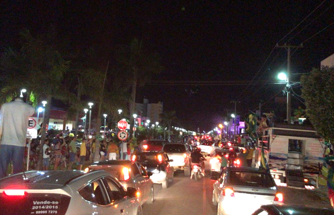Centenas de pessoas estão, neste momento, percorrendo a avenida dos Tarumãs, umas das principais de Sinop, comemorando a vitória de Jair Bolsonaro (PSL) para presidência da República. Com carro som e rojões eles festejam a eleição capitão da reserva do Exército, que teve em Mato Grosso, mais de 66% dos votos. Os eleitores do presidente eleito também comemoraram pela avenida Julio Campos, a principal da cidade. Muitos soltaram rojões para comemorar a vitória.