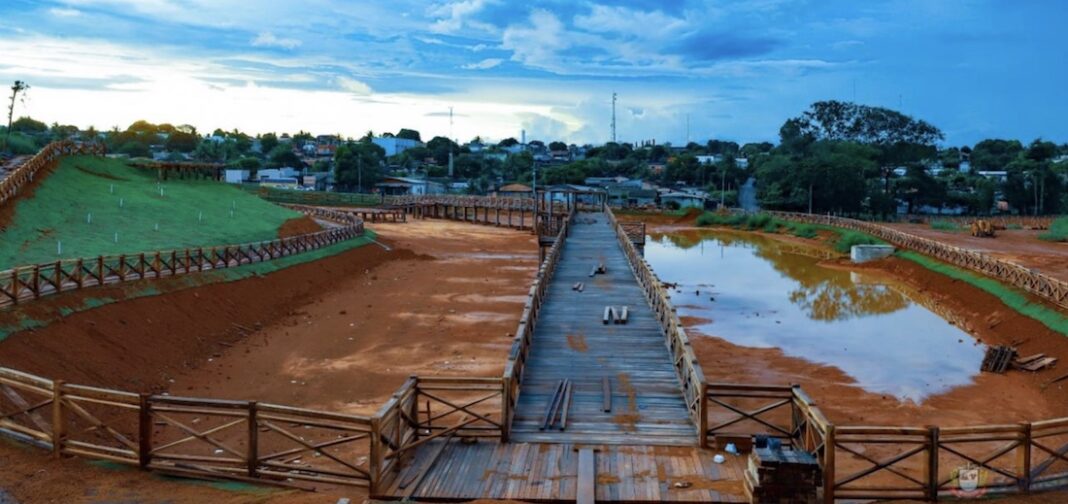 A área de lazer que está sendo construída, na zona leste da cidade, fundos do bairro Vila Bela deve ser concluída em seis meses. O lago terá 1,6 hectares de lâmina d’água e será um dos cartões portais da capital nacional do agronegócio.