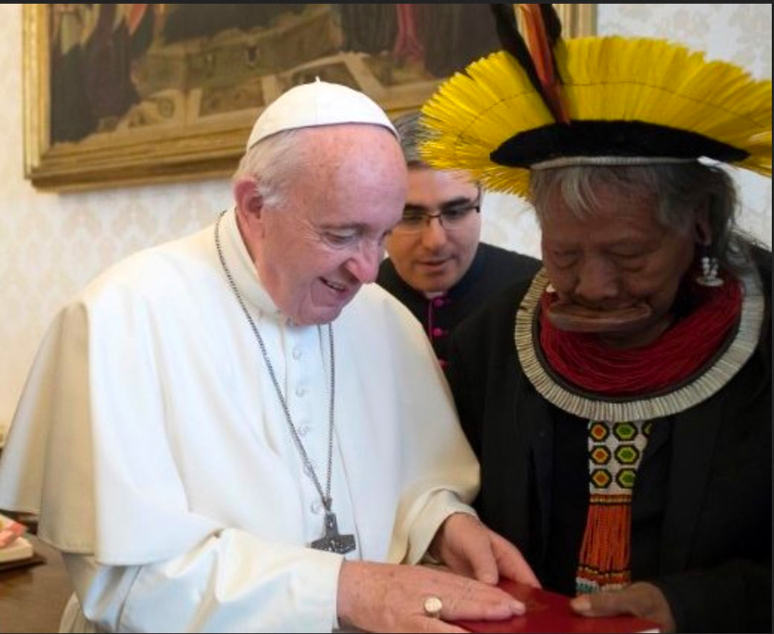 O Papa Francisco recebeu em audiência privada na Casa Santa Marta, em Roma, ontem, o principal líder indígena brasileiro Raoni Metukire, da comunidade Caiapó, que vive no Xingu em Mato Grosso. O cacique está na Europa desde 14 de maio, numa viagem de três semanas, para se encontrar com os chefes de Estado e a opinião pública para alertar sobre as crescentes ameaças à Amazônia.