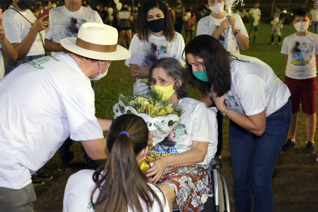 A solenidade de abertura do aniversário de Sinop e dos 29º jogos olímpicos, ontem à noite, foi marcada também por uma emocionante homenagem para as 437 vítimas do Coronavírus. Balões brancos foram soltos pelos participantes da competição. Para representar as famílias e amigos que perderam pessoas queridas em decorrência à doença, a família do desportista Luiz Carlos Simon, o Chucky. Um vídeo, resumindo a trajetória dele, foi reproduzido. Em seguida, a mãe de Chucky e familiares receberam flores, entregues pelo prefeito Roberto Dorner e, pela primeira-dama, Scheila Pedroso. No final, soltaram os balões, ao som de conquistando o impossível, da cantora Jamilly, emocionando a todos.