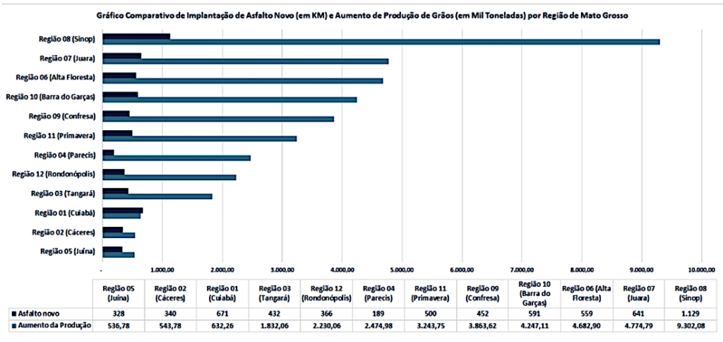 A segunda região que mais recebeu asfalto novo também é a segunda que mais aumentou sua produção total. A região de Juara (300 km de Sinop) recebeu 641 km de asfalto e aumentou a produção em 4,7 milhões de toneladas. A secretaria estadual de Infraestura aponta que, em seguida, aparecem as regiões de Barra do Garças (520 km de Cuiabá – região Araguaia) e Alta Floresta (Nortão), onde foram asfaltados 591 km e 559 km de estradas, respectivamente. Em Barra, o aumento da produção foi de 4,2 milhões de toneladas e, na região e Floresta, houve aumento de 4,6 milhões de toneladas.