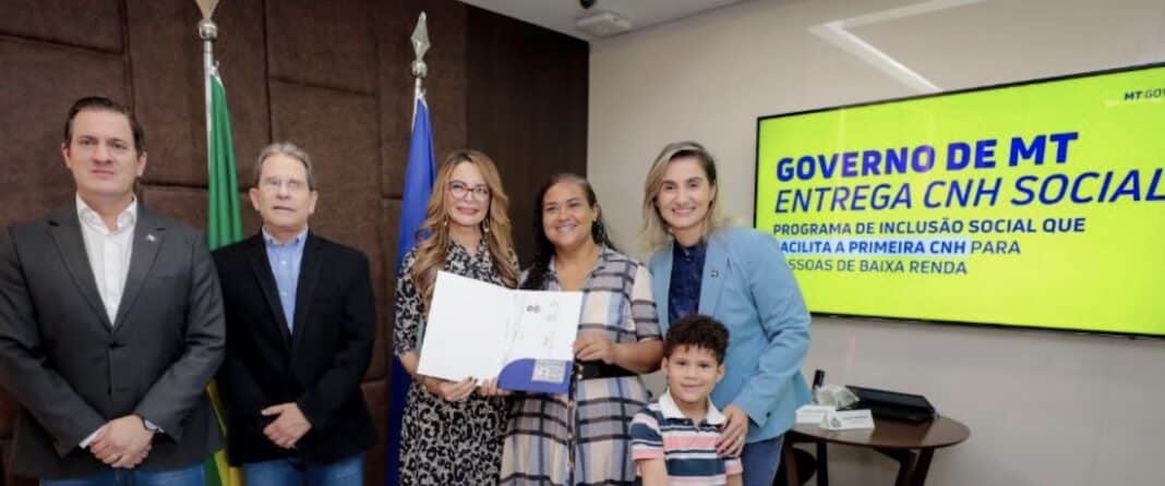 A primeira-dama de Mato Grosso, Virginia Mendes, fez a entrega das quatro primeiras Carteiras Nacionais de Habilitação do programa SER Família CNH Social, ontem, na sala de reuniões do Gabinete do governo do Estado, com a presença dos secretários de Segurança Pública, César Roveri, da Assistência Social e Cidadania, Grasi Bugalho e do presidente do Detran, Gustavo Vasconcelos.