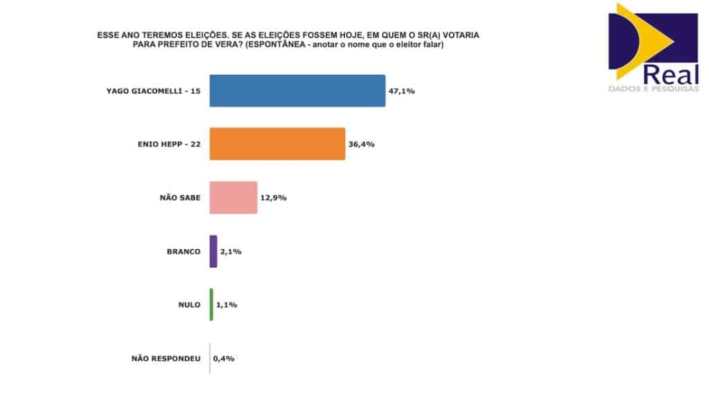 O candidato a prefeito de Vera Yago Giacomelli lidera a nova pesquisa Real Dados/Só Notícias com 53,2% das intenções de votos na modalidade estimulada. Enio Hepp tem 40%. Brancos 2,9%, nulo 1,8% e não sabe 1,4%, não respondeu 0,7%. A margem de erro é de 5,6% para mais ou para menos. A pesquisa foi feita entre os dias 21 e 22 de setembro com 280 eleitores.