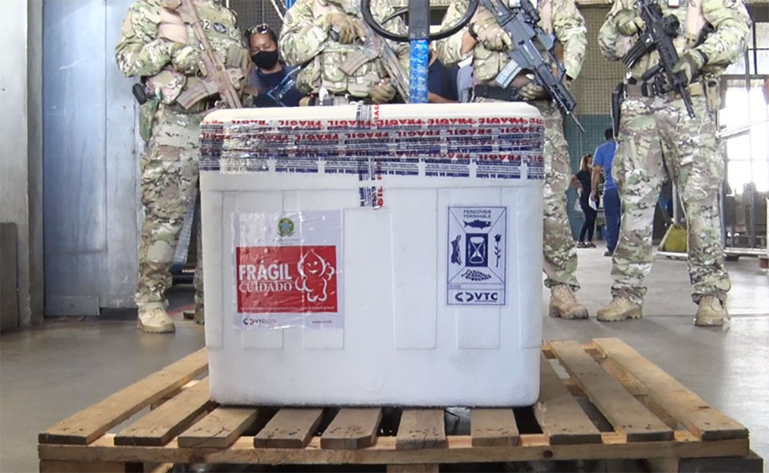 O novo lote, com 71.170 doses de vacinas é destinado para a imunização dos grupos prioritários da campanha nacional. Há cerca de uma hora chegou em um a primeira remessa com 23.200 doses da Coronavac. Para às 17h10 devem chegar mais 47.970 doses da Pfizer.