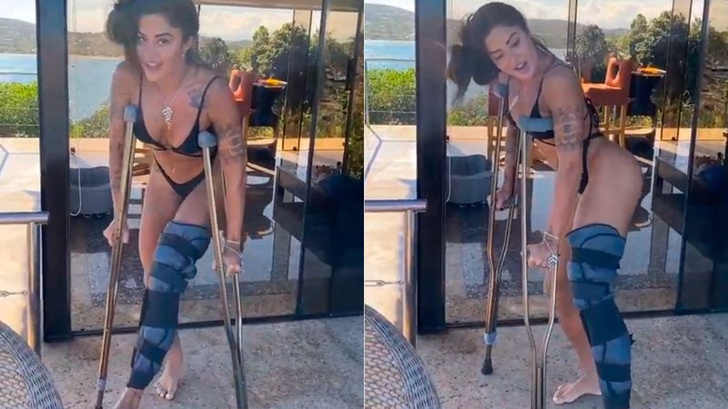 Aline Riscado acabou deslocando o joelho esquerdo durante uma partida de altinha com a amiga Guta Furlanetto, mas não deixou de aproveitar a estadia em um luxuoso resort em Búzios, no Rio de Janeiro, onde está hospedada. Nos stories instagram, a ex-bailarina do Domingão do Faustão compartilhou vídeos nos quais aparece com a perna imobilizada e se locomovendo com ajuda de muletas.