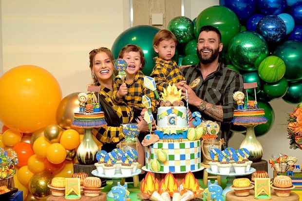 No último domingo, Gusttavo Lima e Andressa Suita comemoraram os 3 anos do filho mais velho, Gabriel. Para não deixar a data passar em branco, os pais fizeram uma decoração caprichada, bem colorida em clima junino.