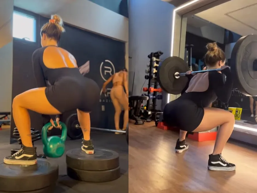 Os vídeos foram compartilhados nos stories da atriz. Nas gravações, ela aparece de macacão, fazendo agachamentos, exibindo seu corpo escultural e pernas torneadas.