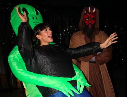 Ela optou por um traje inusitado que simula uma “abdução alienígena”, já que estava dentro de uma roupa inflável como “refém” de um ET.