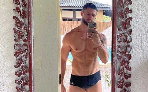 Na foto, o ex-BBB surgiu diante de um espelho, usando uma sunga preta, enquanto destaca seu peitoral nas redes sociais.