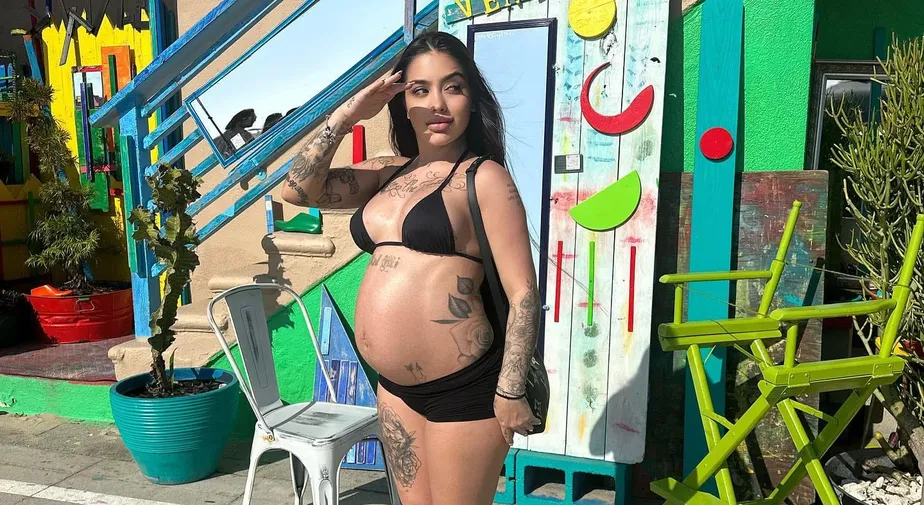 Nas imagens, a funkeira aparece de biquíni e shorts, exibindo seu barrigão e suas inúmeras tatuagens estratégicas.