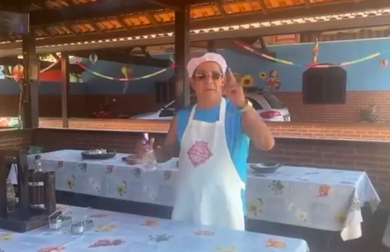 Gesticulando para a mesa cheia de bebidas alcoólicas, completou: “Cheio de álcool, mas álcool só na mão!”.