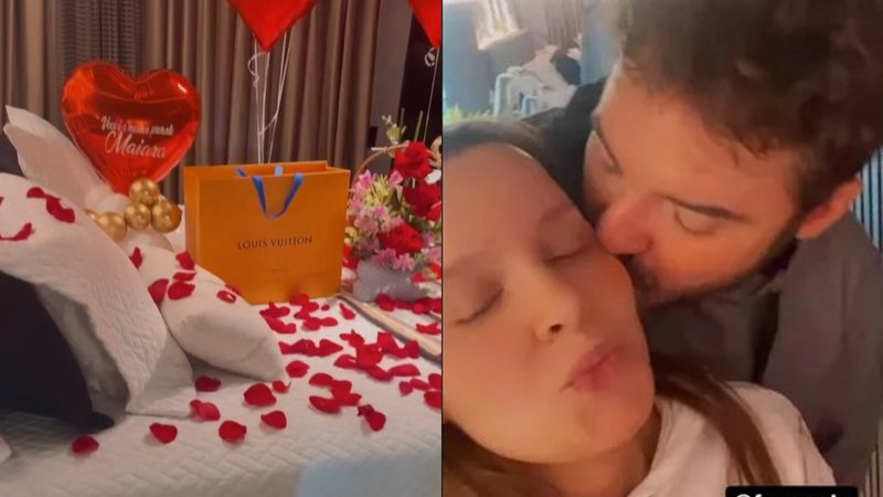 Na tarde desta segunda-feira, a cantora Maiara, da dupla com Maraisa, recebeu uma surpresa de seu noivo, o também cantor Fernando Zor. A cantora filmou a cama do casal que estava enfeitada com várias pétalas de rosa, além de um buquê de flores e um presente da famosa grife “Louis Vuitton”.
