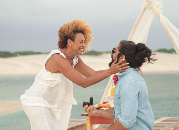 “Depois de 10 anos, um filho lindo e muitas histórias, ao nascer do sol, nas areias brancas das dunas dos Lençóis Maranhenses, você ajoelhou e me surpreendeu… fui tomada por uma alegria imensa, a mesma que sempre tive ao seu lado só que potencializada!!! Estar com vc sempre foi minha escolha, mas dentro desta Fiona tem um cantinho romântico e você soube fazer do jeitinho certo pra nós!! Foi divertido, foi engraçado, foi lindo, foi maravilhoso!!! Foi tão a gente!!!!! Que história linda temos pra conta hein!!! E quantas outras temos a nos esperar… o Shrek de alma doce ajoelhou e eu disse sim! @saulocamelo te amo 🧡”, escreveu ela na legenda da publicação.